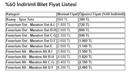 İndirimli bilet satışları SADECE Chobani Stadyumu Fenerbahçe Şükrü Saracoğlu Spor Kompleksi Maraton tarafında bulunan Passo gişesinden yapılacaktır.